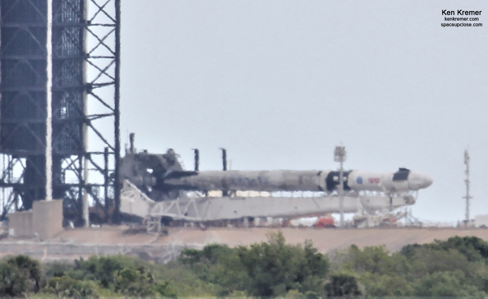 The 215-foot (65-meter)) Falcon 9 rocket was rolled out and up the incline to pad 39A Friday morning April 16 from the hangar outside the pad perimeter fence and raised erect late Friday afternoon April 16 prior to the April 17 engine test and is poised for liftoff to deliver the astronauts to the ISS on April 22.