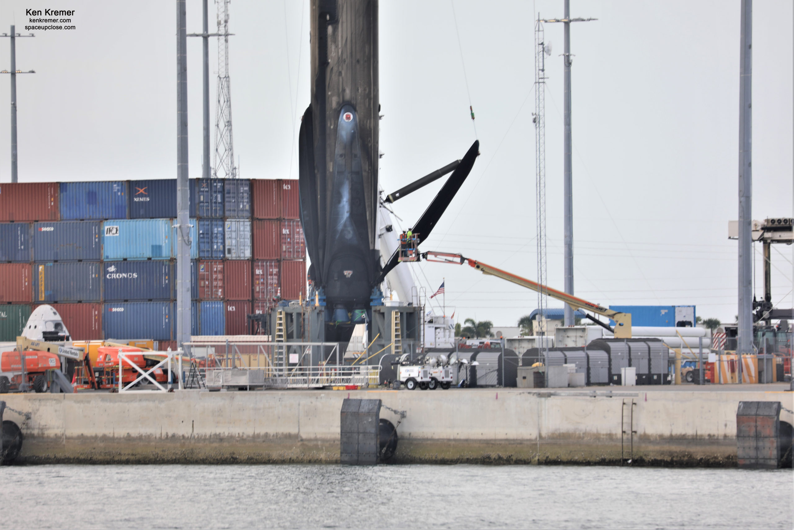 PORT CANAVERAL, FL – In another remarkable first for a mission already full of stunning firsts all four landing legs were retracted today June 9 on the first ever 5 times launched and landed SpaceX Falcon 9 first stage – specifically on the 8th Starlink mission after the booster returned triumphantly to Port Canaveral Sunday evening, June 7, standing upright and sooty atop the ‘Just Read the Instructions’ (JRTI) ocean going droneship – under heavily overcast skies and delayed by poor East Coast weather all week as we reported earlier.